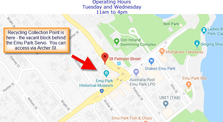 LOCATION: ……Recycling Depot is located behind the Emu Park BP Servo, 38 Pattison Street